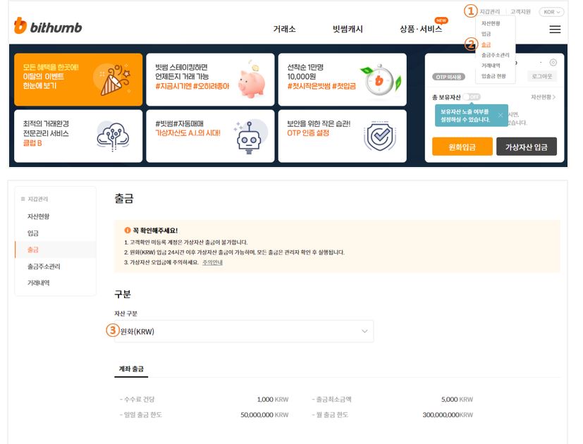 그림에 적힌 주황색 동그라미를 따라가시면 쉽게 원화를 출금하실 수 있습니다.